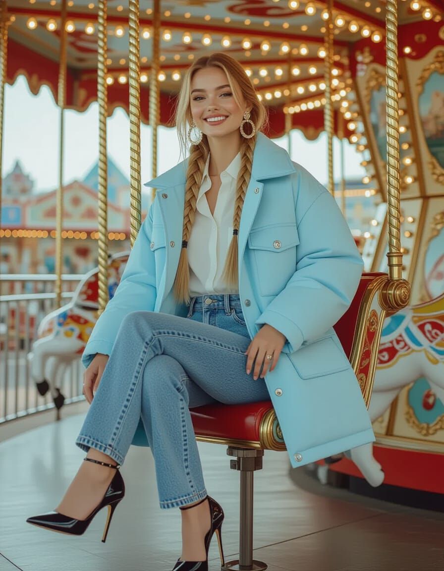 A smiling woman in a blue jacket and black stilettos sits on a high chain carousel. The photorealistic image features cinematic lighting and a shallow depth of field, capturing vibrant details of the amusement park.