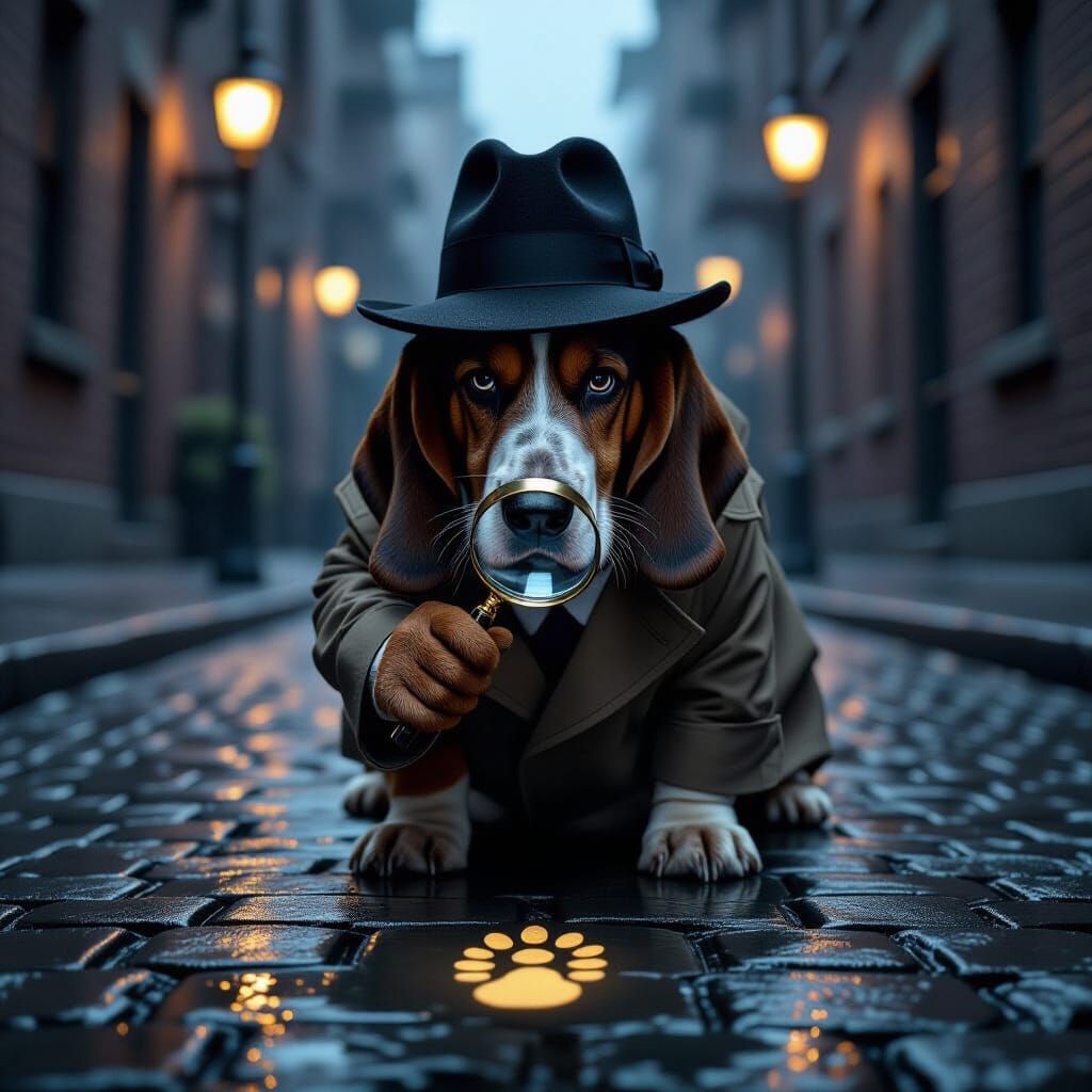 This hyperrealistic image shows a Basset Hound dressed as a film noir detective, investigating a footprint with a magnifying glass. Moody lighting and fog enhance the gritty atmosphere.