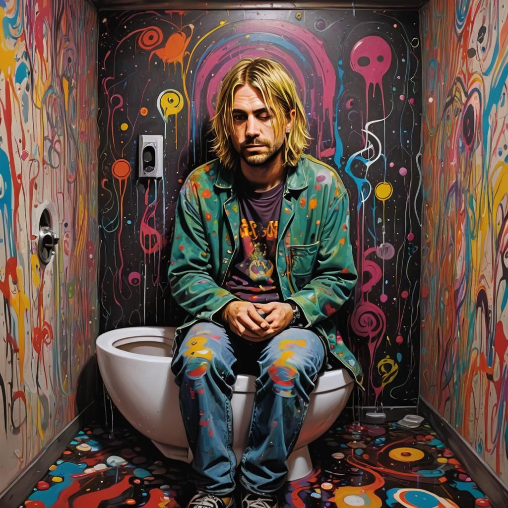 Kurt Cobain on a toilet, ayahuasca psychedelic art by Munk One and Tim Burton, dynamic lighting, 8k resolution concept art masterpiece, drip...