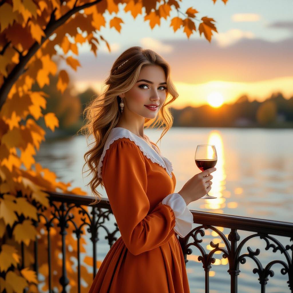 This image shows a woman on a balcony overlooking a lake at sunset. She is dressed in orange and admires the view with a glass of wine. The scene is photorealistic with soft, golden lighting.