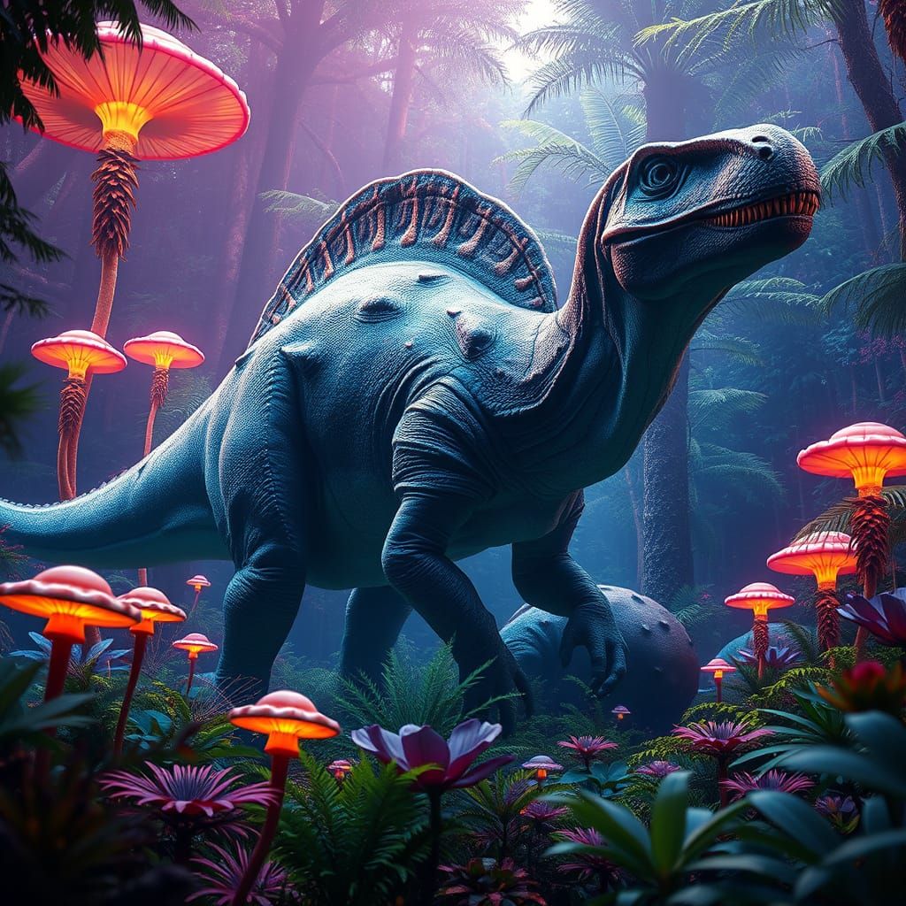 This image shows an Apatosaurus in a colorful Jurassic forest filled with unusual plants and glowing mushrooms. The scene is lit dynamically and rendered in hyper-realistic detail, as vibrant digital art.