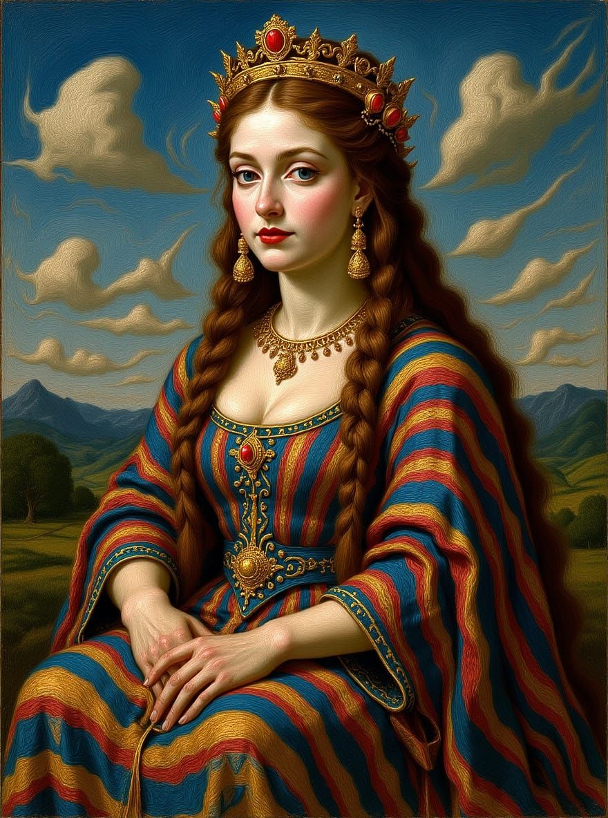 This image shows a goddess with giant ribboned braids and fractal gown in a surreal landscape. The art features thick, textured brush strokes reminiscent of oil painting techniques.