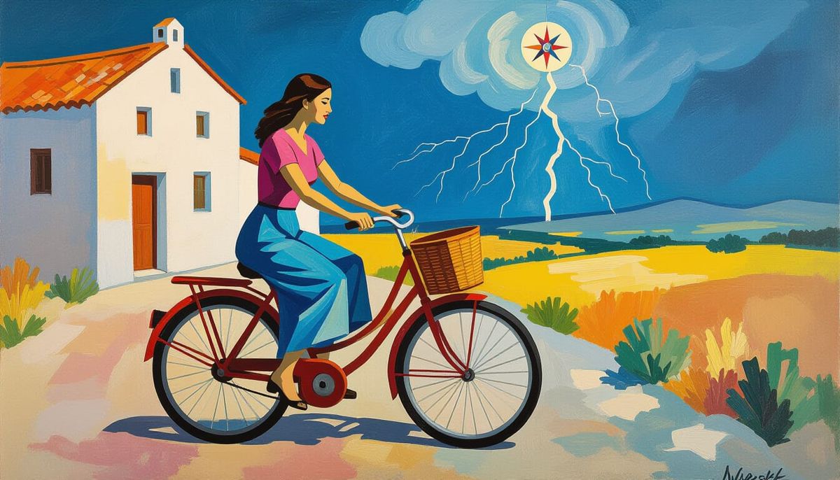 This image depicts a woman riding a rusty bicycle with a compass, set against a backdrop of thunder and storm clouds, rendered in a vibrant, expressive artistic style.