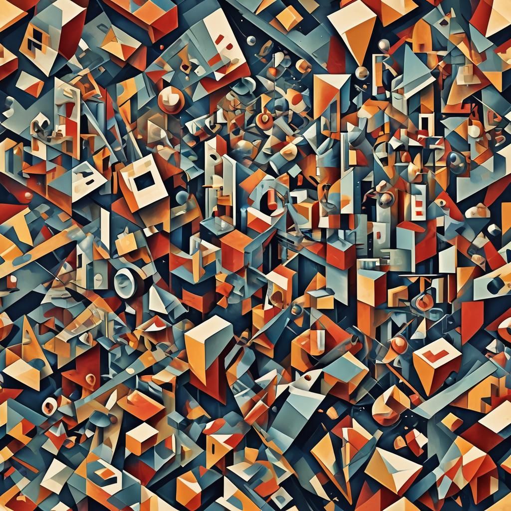 A cubist abstract dreamscape featuring layered overlapping geometry in the style of geometric fauvism. The image is rendered with V-Ray and Unreal Engine 5.