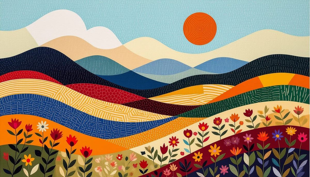 This image features a 3D embroidered landscape with scintillating Ndebele patterns in earthy tones, inspired by layered artistic styles.