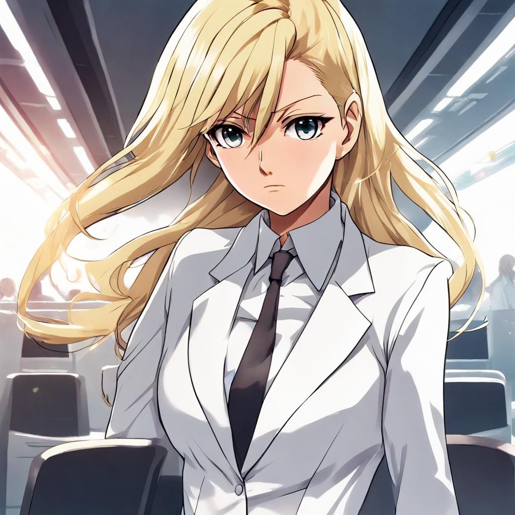 This image portrays a blonde woman in a white suit, her expression fearless. The artwork is reminiscent of anime key visuals and Japanese manga art styles.