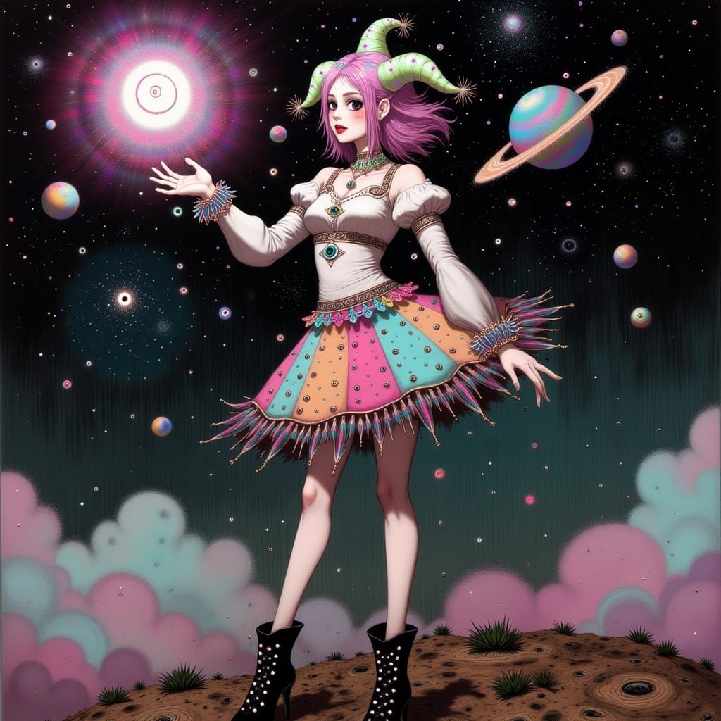 This image shows a confident Harley Quinn in a vibrant, eclectic costume adorned with zodiac symbols, standing in a fantastical realm of swirling nebulae and orbiting planets, blending digital and traditional media with dynamic brushstrokes and radiant hues.