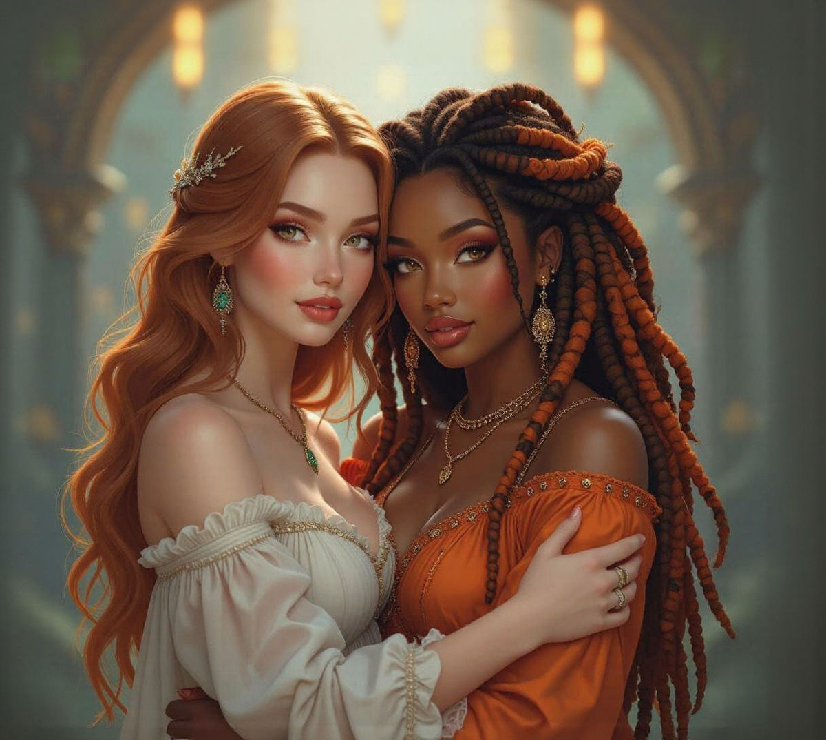 This image shows two women with vibrant hair, rendered with dynamic lighting and intricate details. The artwork features triadic colors and volumetric lighting, reminiscent of Alphonse Mucha's style.