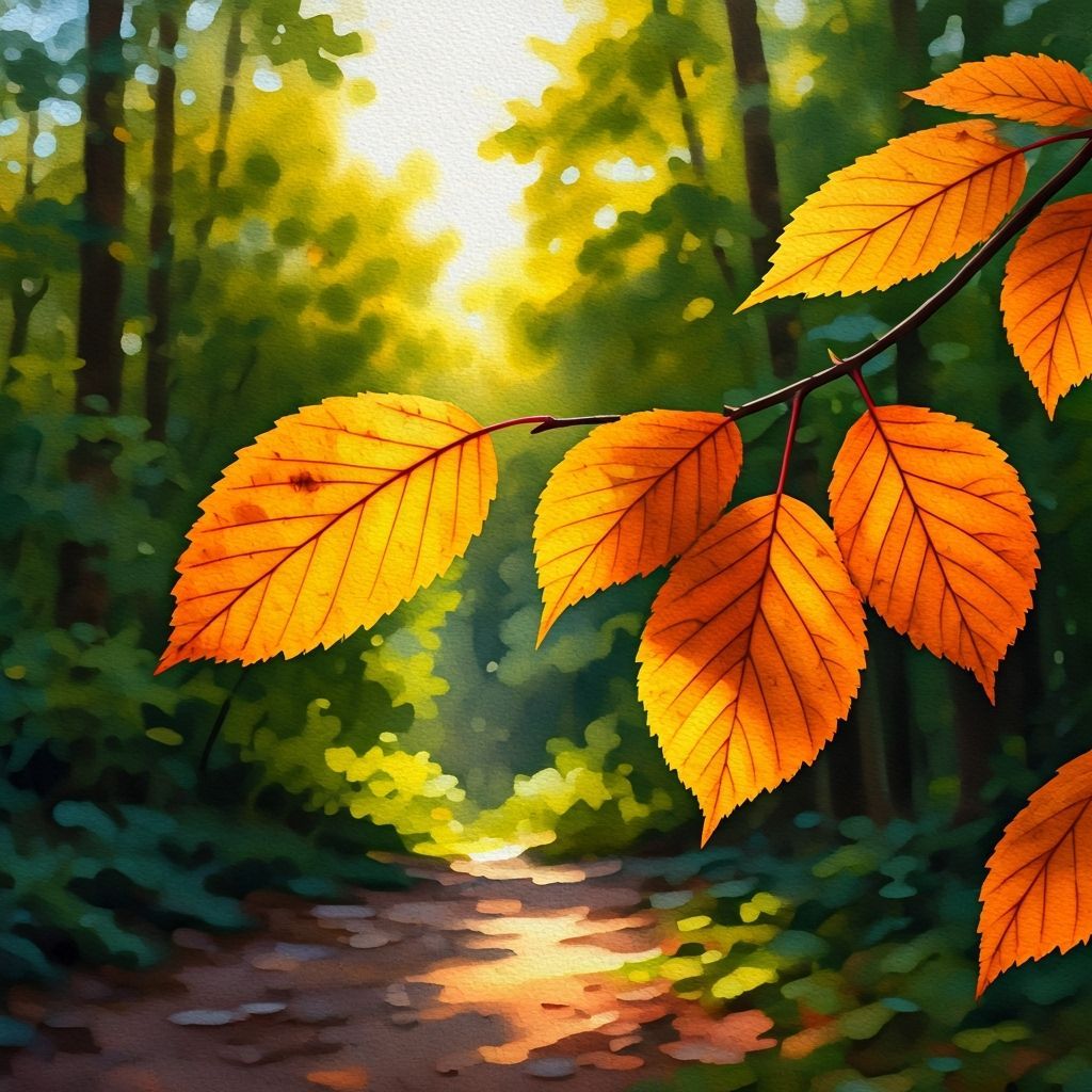 This image showcases vibrant autumn leaves bathed in warm golden light, rendered in a delicate watercolor style with expressive brushstrokes and subtle textures.