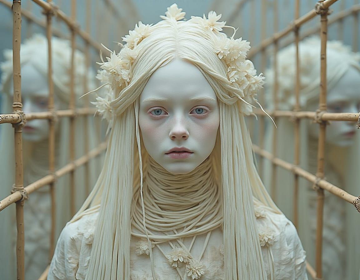 she's hollow mirrors on nature mock her embodied ivory-white hair like scaffolding holds a series of recursive wild mirrors climbing up and around her bunched hair-strands in layered hollowness reflecting the futility of right now pull back into a wide angle wild angle full-length long shot mirroring ...