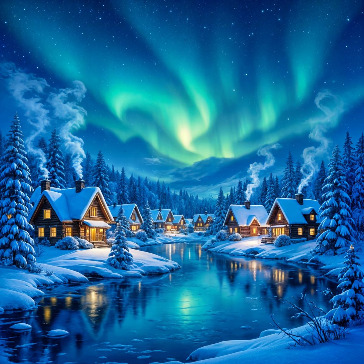 A panoramic digital painting captures a serene Christmas village blanketed in snow, illuminated by the aurora borealis. Evokes a magical winter wonderland atmosphere.
