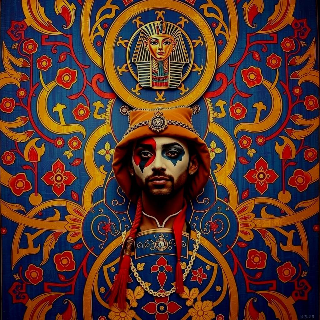 This image features a full body, long shot of a Harlequin, Geisha, and Tutankhamun combined. It showcases fine details and sharp focus for a photorealistic, high-resolution result.