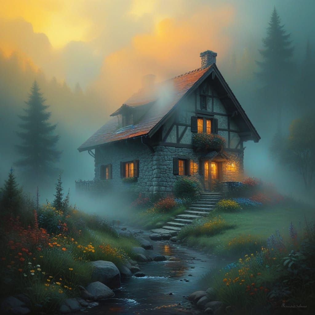 This image depicts a serene Swiss chalet nestled among wildflowers and a small stream, surrounded by a misty atmosphere in warm, inviting colors reminiscent of traditional folk art.