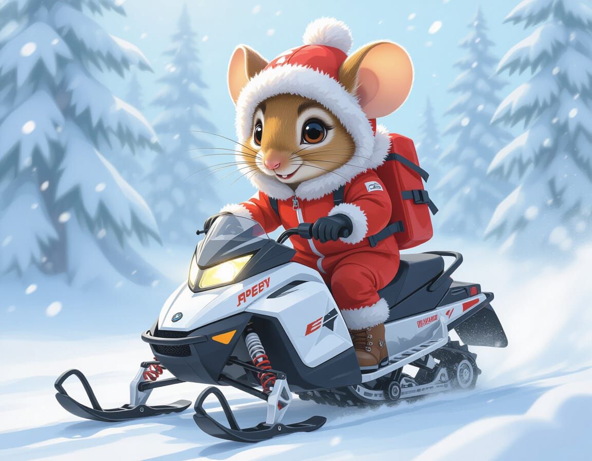 Illustration depicting a mouse on a snow mobile. wearing a snow suit and boots, whimsical with big eyes and distinctive features, a quirky cartoon style, on a white background, d&d, fantasy, highly detailed, digital painting, artstation, sharp focus, fantasy art, illustration, 8k, in the style of greg ...