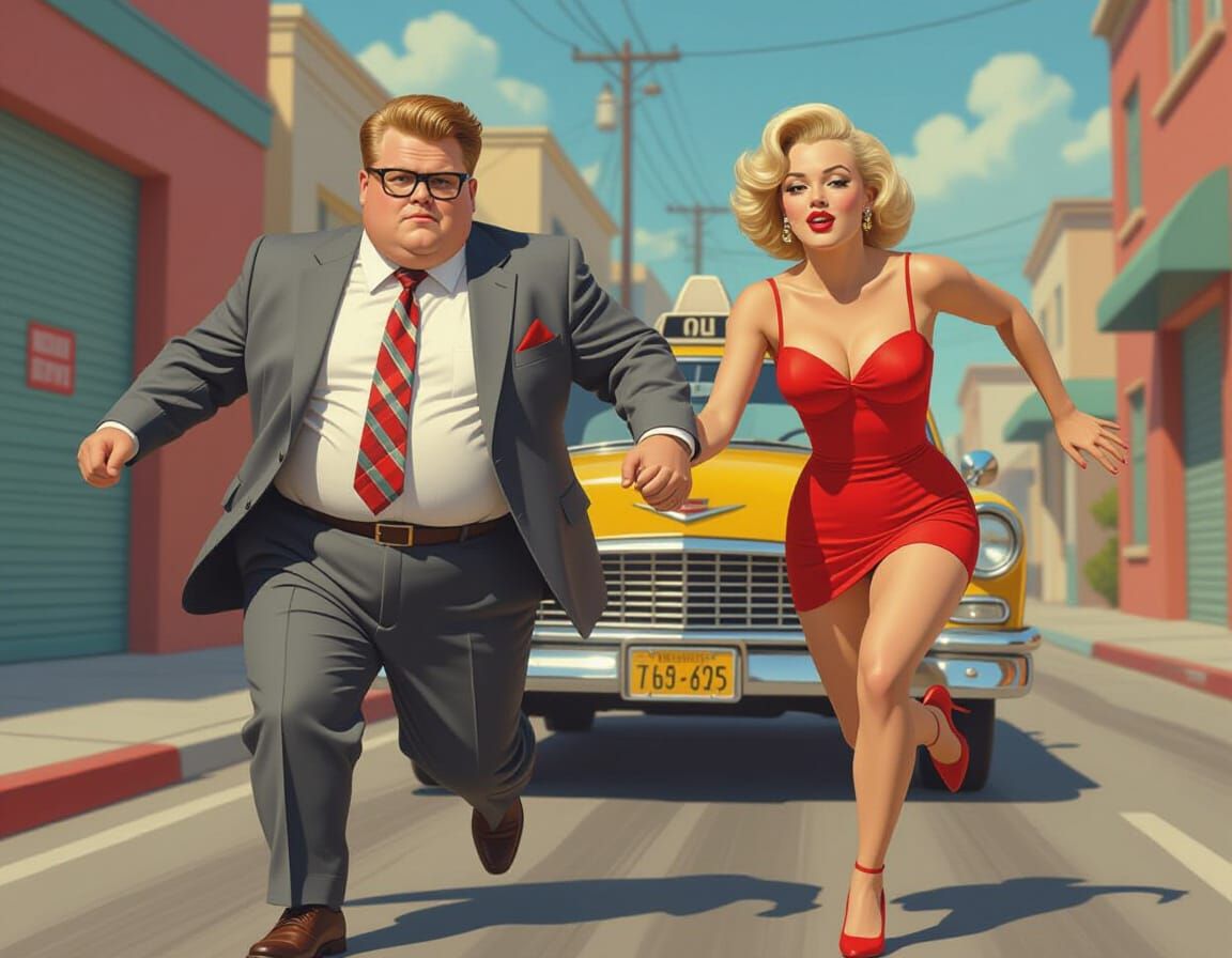 A comic-book style image of Marilyn Monroe and a man resembling Jesse Plemons running from a taxi. Set in a sunny Los Angeles alley, the image evokes a 1970s film poster aesthetic.