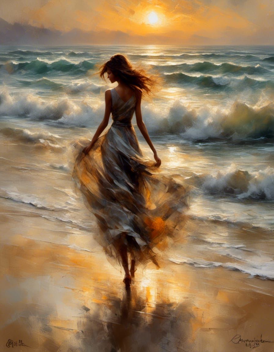 A breathtakingly beautiful image of a fashion model walking along a beach at sunset. The artwork captures the scene in an impressionistic style with soft brushstrokes and a warm, vibrant color palette.