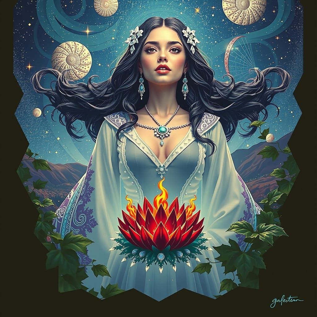 A striking picture of a beautiful woman with dark hair against a starry sky. She wears flowing attire with silver and green accents, rendered in a photorealistic CGI aesthetic.
