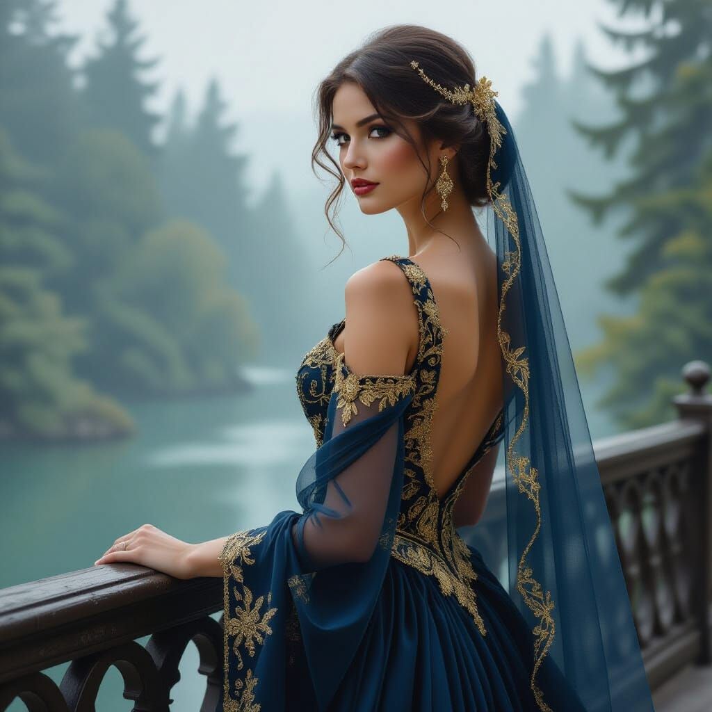 A close-up of a beautiful woman in a bejeweled gold and blue dress, standing on a bridge with a misty forest behind her. This digital art is rendered with intricate detail and atmospheric lighting.