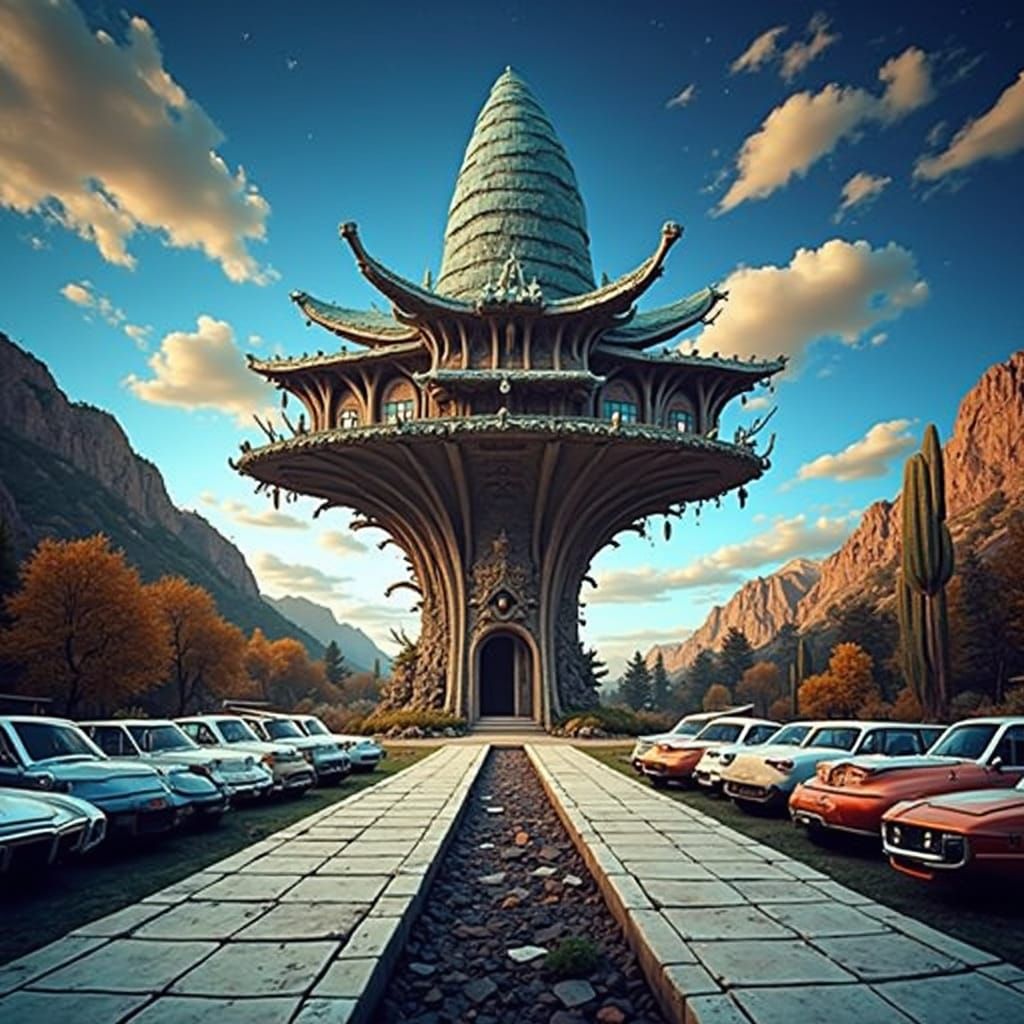 This image depicts a massive, ancient Persian-style plant emerging from a stone-encrusted medieval house. A retro-futuristic junkyard with vintage cars fills the foreground, rendered in a blend of Art Nouveau and Industrial Gothic styles.