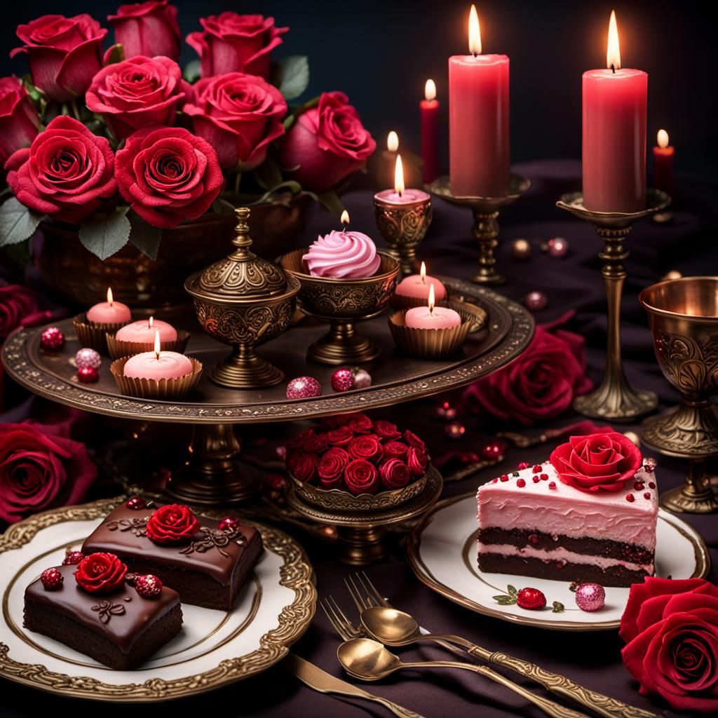A striking picture of a table set for two in a dark fantasy style. Crystal glasses, bronze candlestick, chocolates, cake, and roses are illuminated by warm candlelight, casting deep shadows with purple and yellow hues.