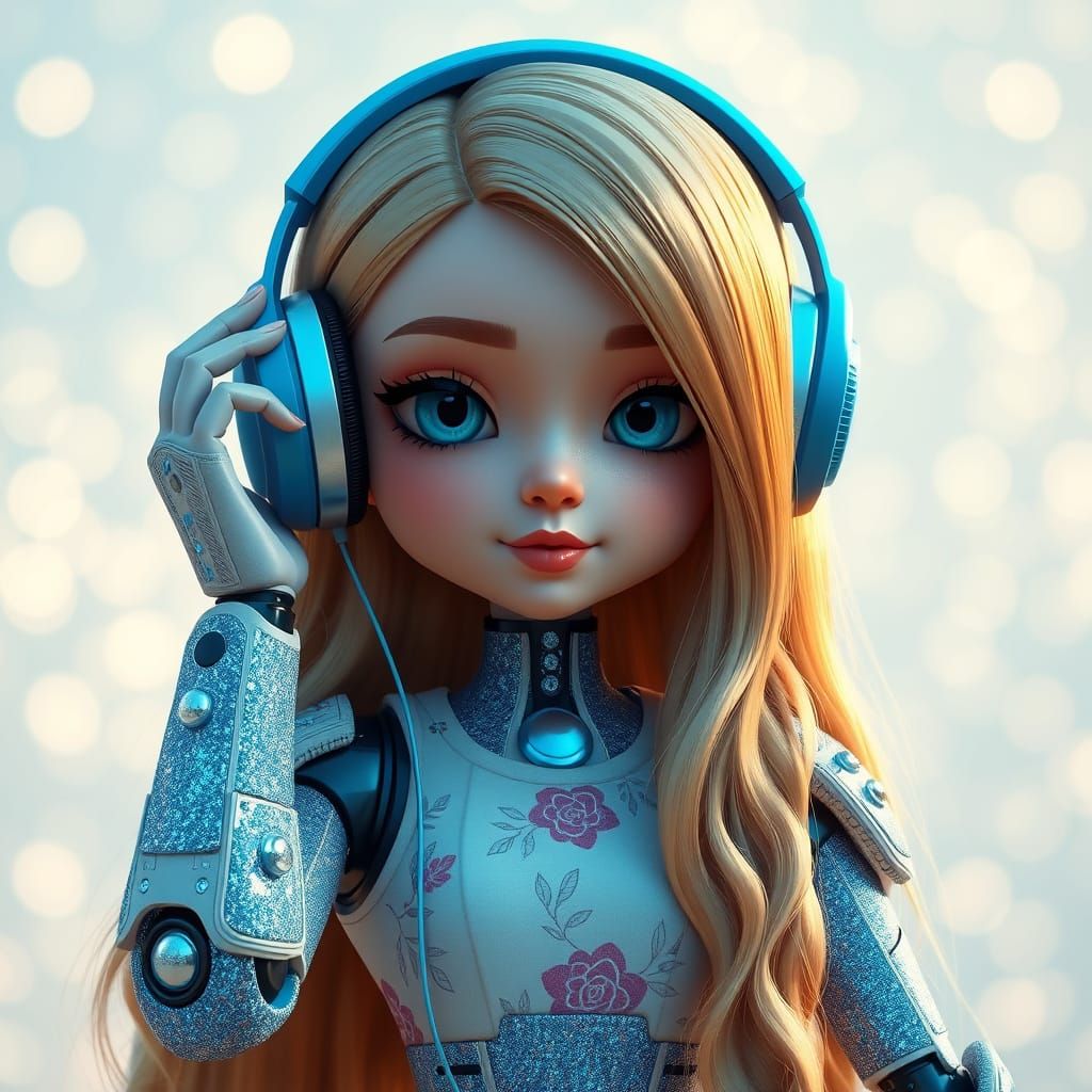 This image shows a beautiful 3D woman with long, golden hair and smokey blue makeup. She is posed in front of a glittering backdrop, in a cinematic digital art style.