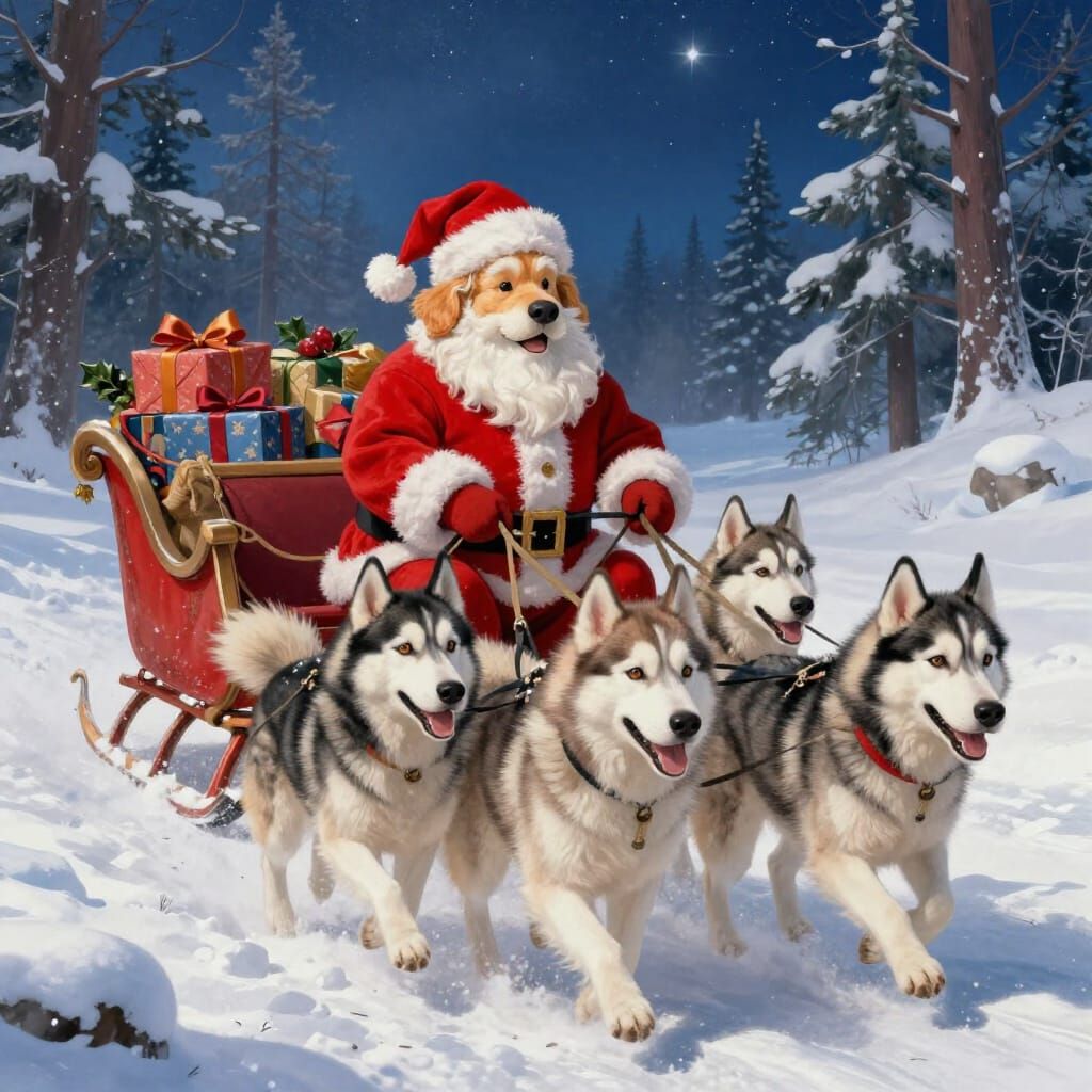 This image shows six fluffy huskies pulling a gift-laden sleigh through a snowy forest. A golden retriever Santa, dressed in red, guides them under a starry night sky. Rendered in a detailed digital matte painting style.