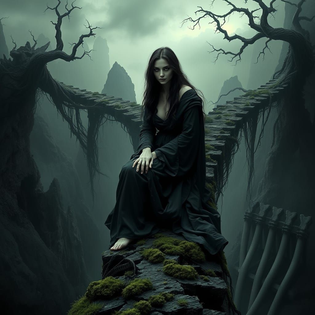 This haunting image depicts a serene goddess sitting on a decrepit, ancient bridge, surrounded by twisted, nightmarish trees and a seemingly bottomless chasm. The eerie, perpetual twilight atmosphere is characterized by meticulous, hyper-realistic textures and dark, surrealistic lighting.