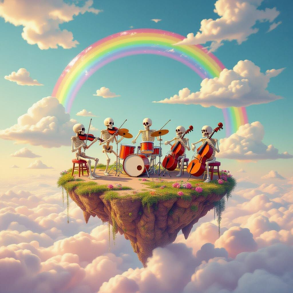 This image shows a joyful skeleton band performing on a floating island amid candy-colored rainbows and swirling clouds. The scene is rendered as hyperdetailed digital art with dynamic lighting in a playful, whimsical style.