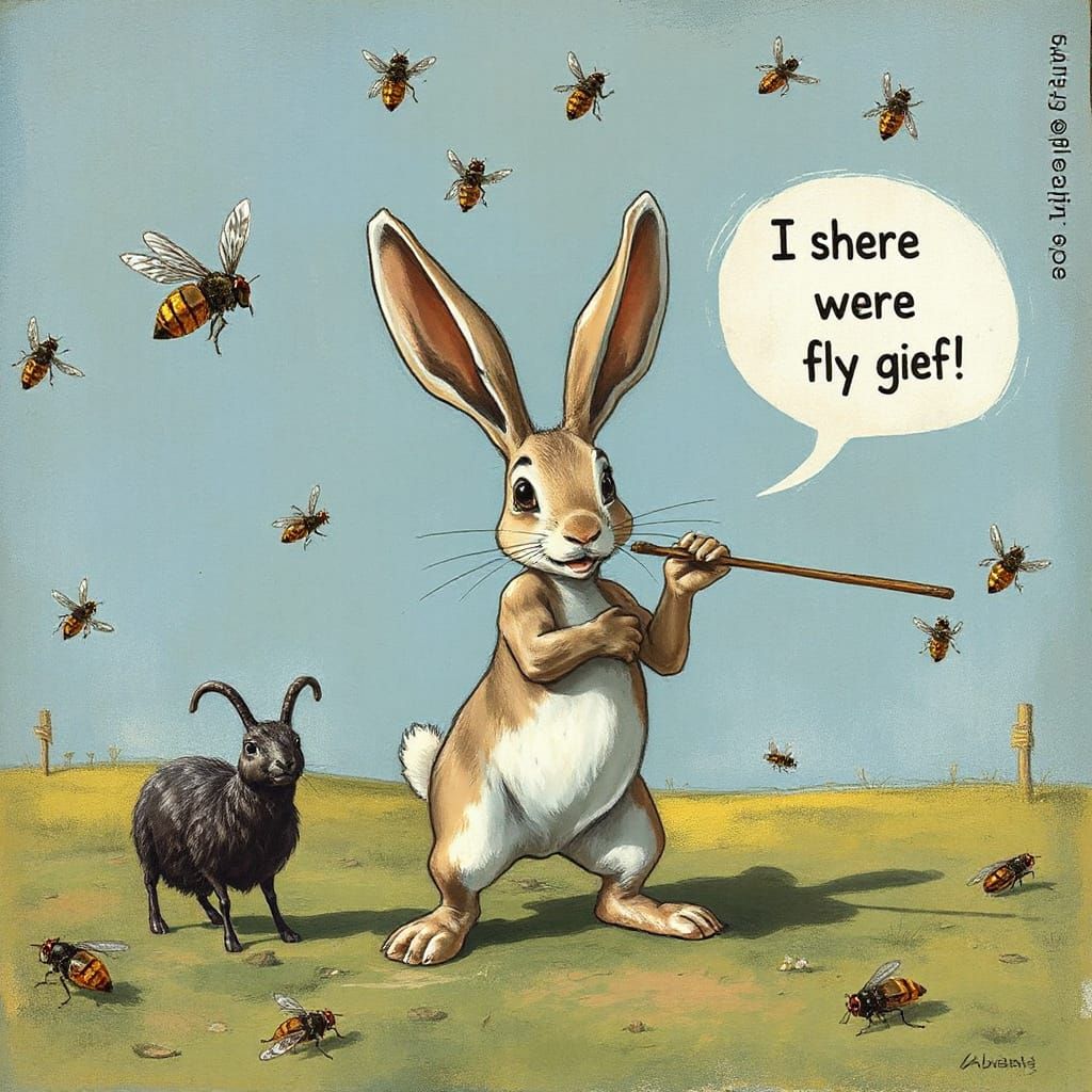 This image depicts a rabbit overwhelmed by swarming flies, symbolizing grief. The artwork is rendered in the distinctive caricature style of Koshiro Onchi and Pavel Filonov.