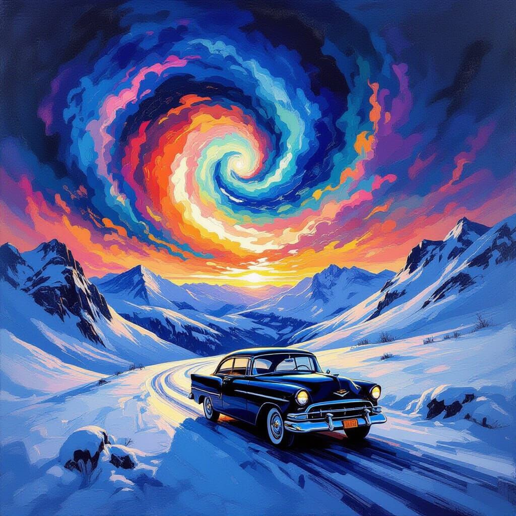 A vintage black car journeys through a snow-covered mountain pass under a dramatic sky of swirling abstract colors. Features a painterly, impressionistic style with bold brushstrokes and ethereal lighting.