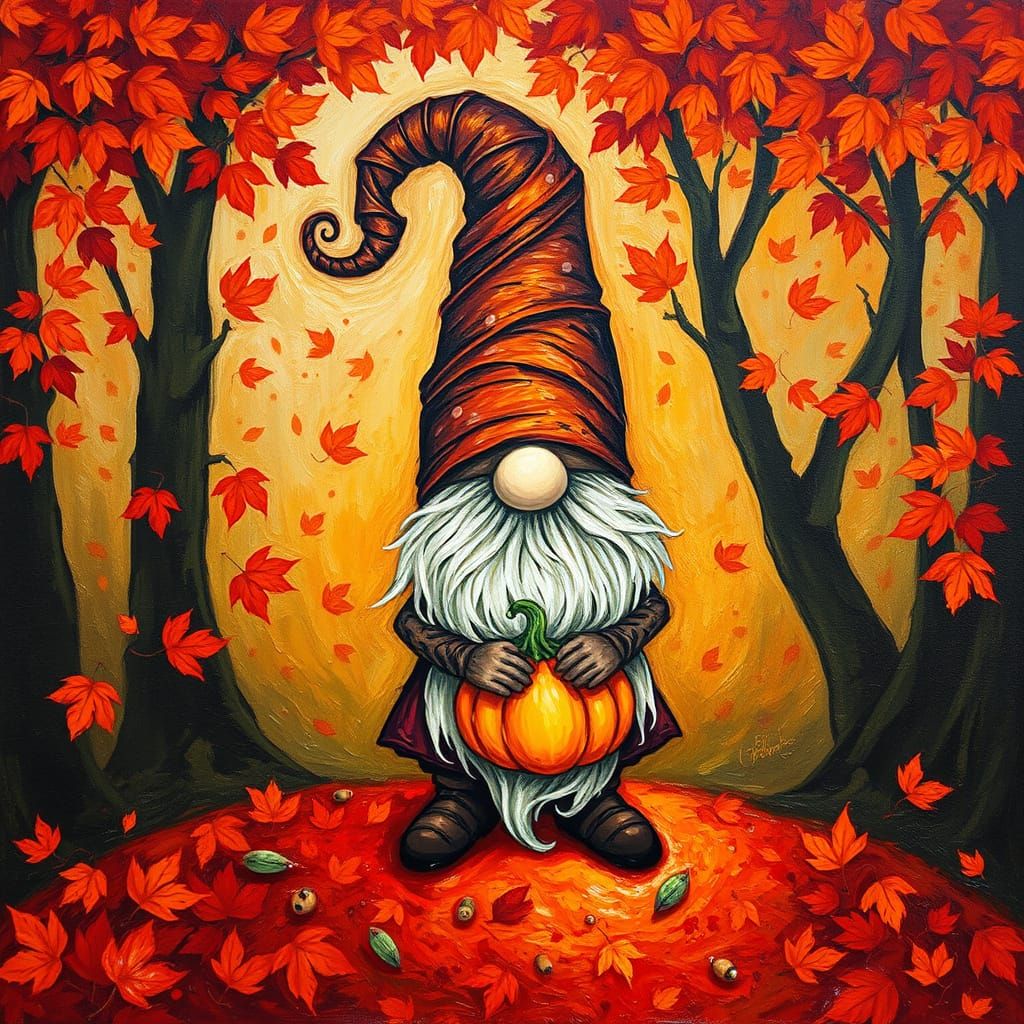 This image shows a gnome in an autumn forest, rendered as an impasto acrylic painting. The gnome holds a glowing pumpkin, with swirling foliage and a warm, golden light creating a mythic scene.