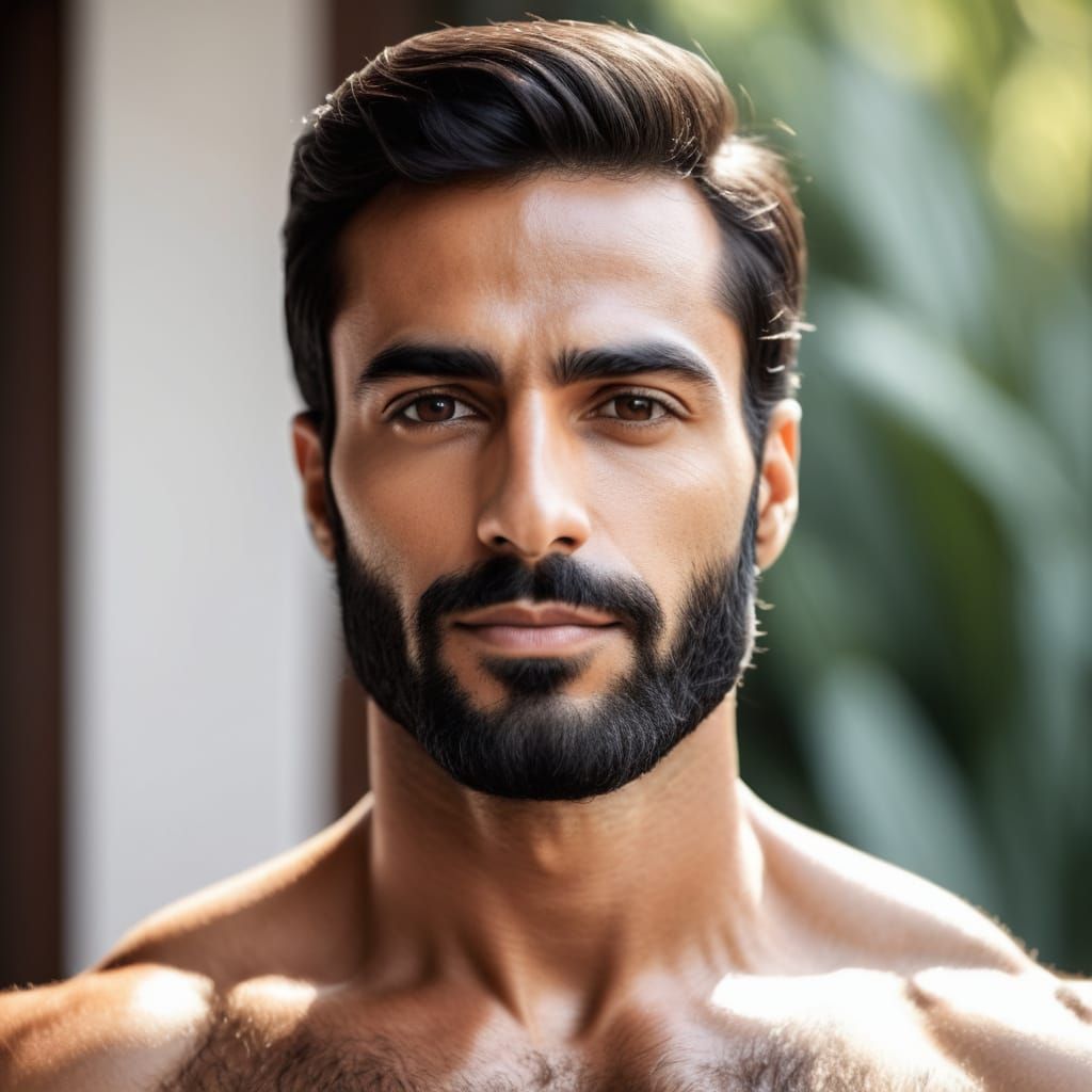 This image shows a hyperrealistic portrait of a handsome, hairy, shirtless Arab man. The image captures the striking details of his face and chest, with smooth skin and warm lighting.