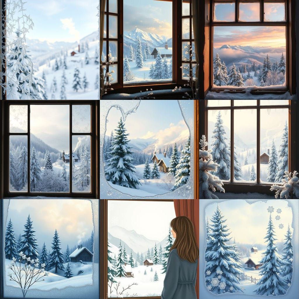 This image shows a serene winter scene from a mountain window, featuring snow-covered trees and delicate ice flowers on the glass, with a distant cabin's chimney puffing out smoke.