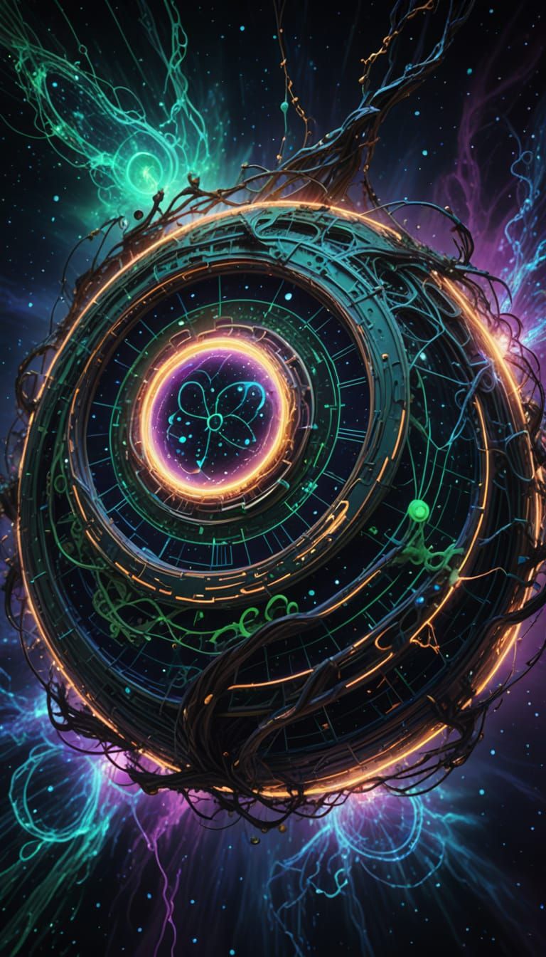 This digital matte painting showcases an anthropomorphic Mother Nature figure with a glowing, complex equation beside her against a vibrant cosmic nebula. Features neon lighting and abstract technology themes.