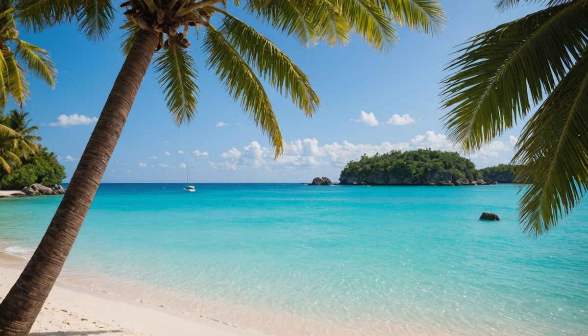 This image showcases a pristine tropical beach with vibrant, turquoise waters. Captured with professional photography techniques, it features a bokeh effect and natural lighting for a stunning visual.
