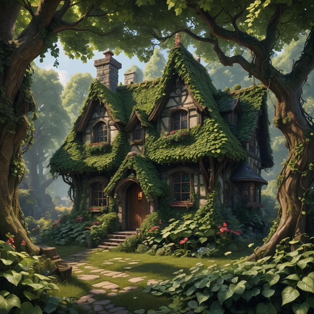 A detailed matte painting of a storybook cottage nestled in a forest, with ivy-covered walls. This fantasy concept art features deep colors and intricate details in 8k resolution.