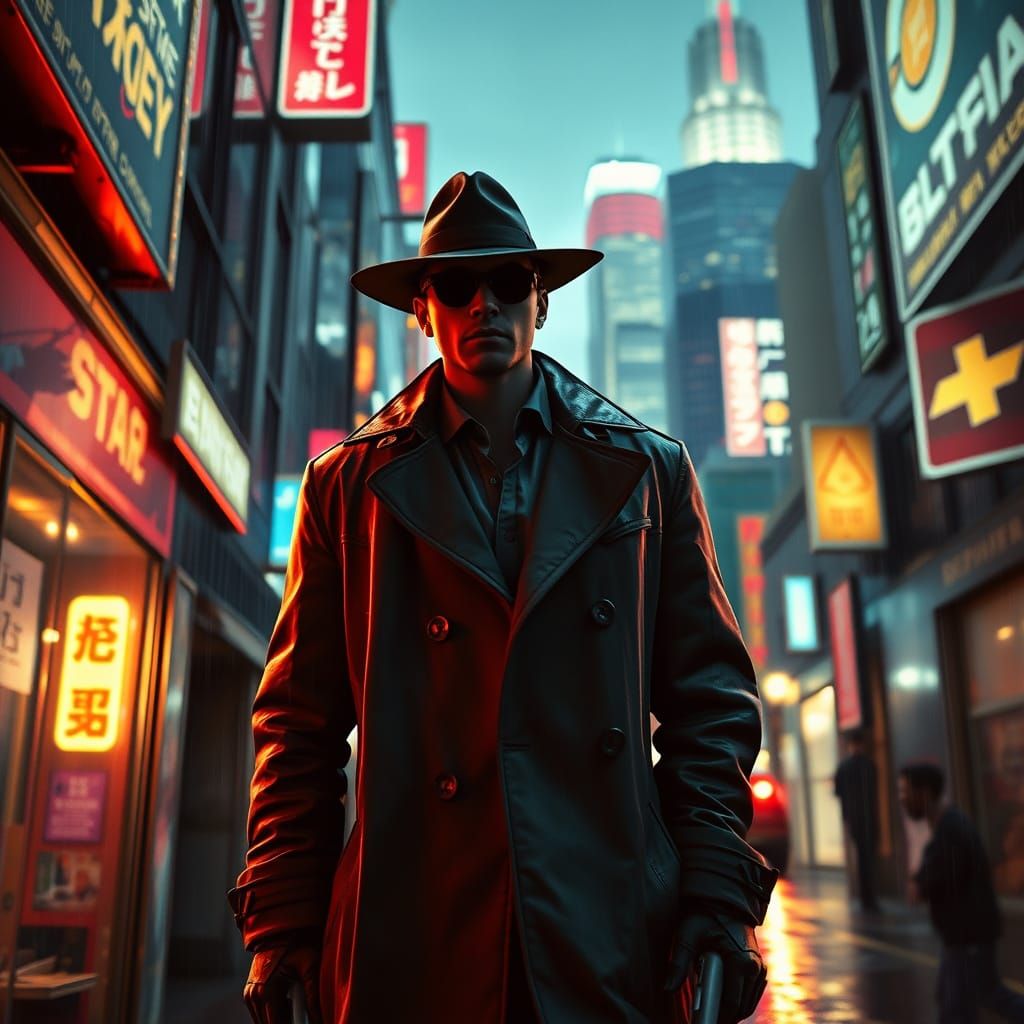 This image shows a cyberpunk detective in a rain-soaked alleyway, lit by neon. Skyscrapers and holographic ads form the chaotic backdrop in this cinematic, atmospheric film still.