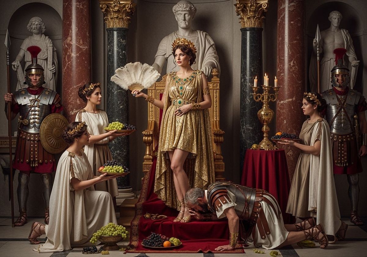 This image shows Empress Messalina in her throne room, attended by servants and Roman dignitaries. The photograph captures the opulence of the Roman Empire with sharp detail and natural lighting.