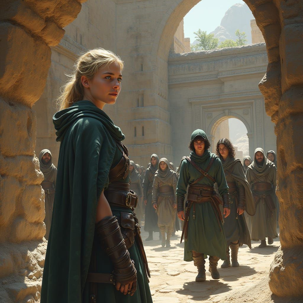 A digital painting of a woman in a green cloak exploring an ancient hideout. The image features apprentices and architecture with Arabic, Roman and Greek influences, in a Stalenhag style.