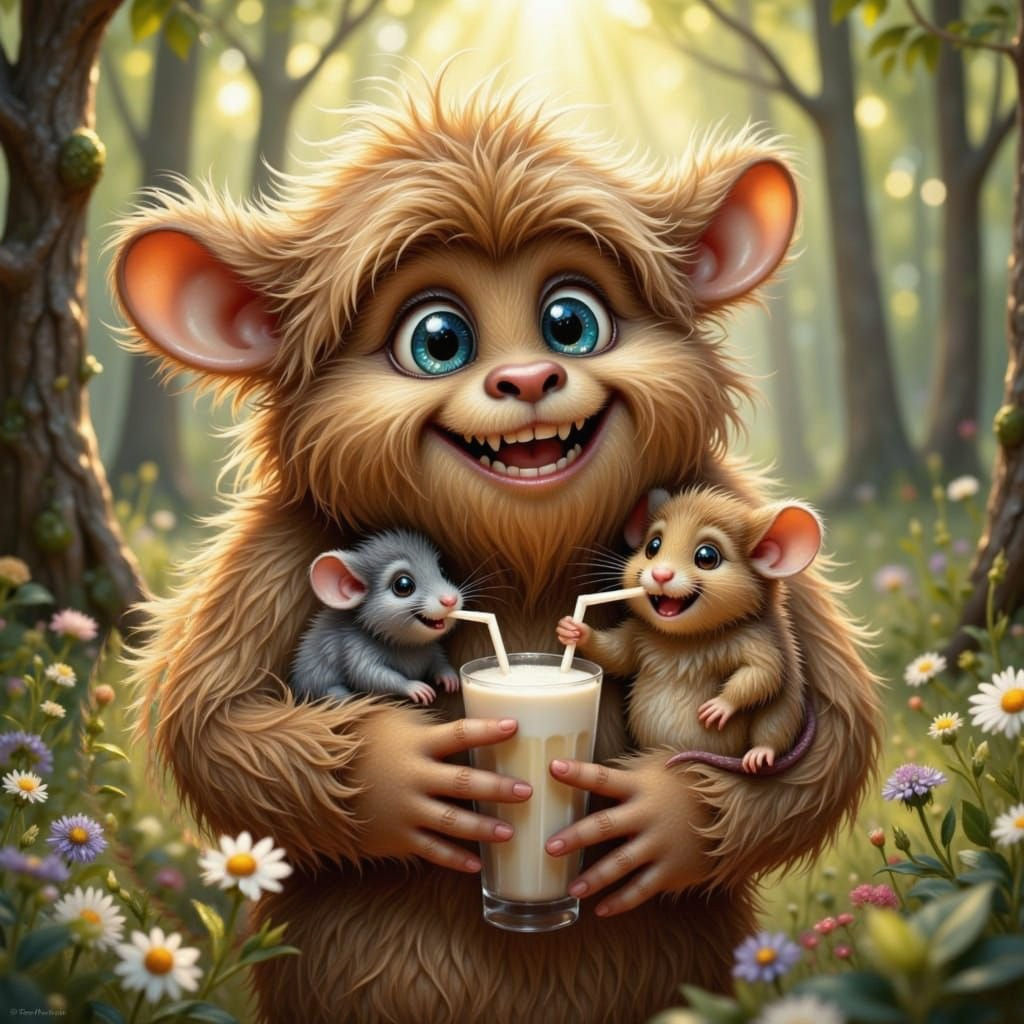 "<lora:Diamond Painting:1.0> <lora:Flux Furry Fantasy:1.0> <lora:white mouse:1.0> Tender scene, Bigfoot the wooly creature with small ears carries a small mouse . both are smiling. EAch has a straw in his mouth, sipping a milkshake"