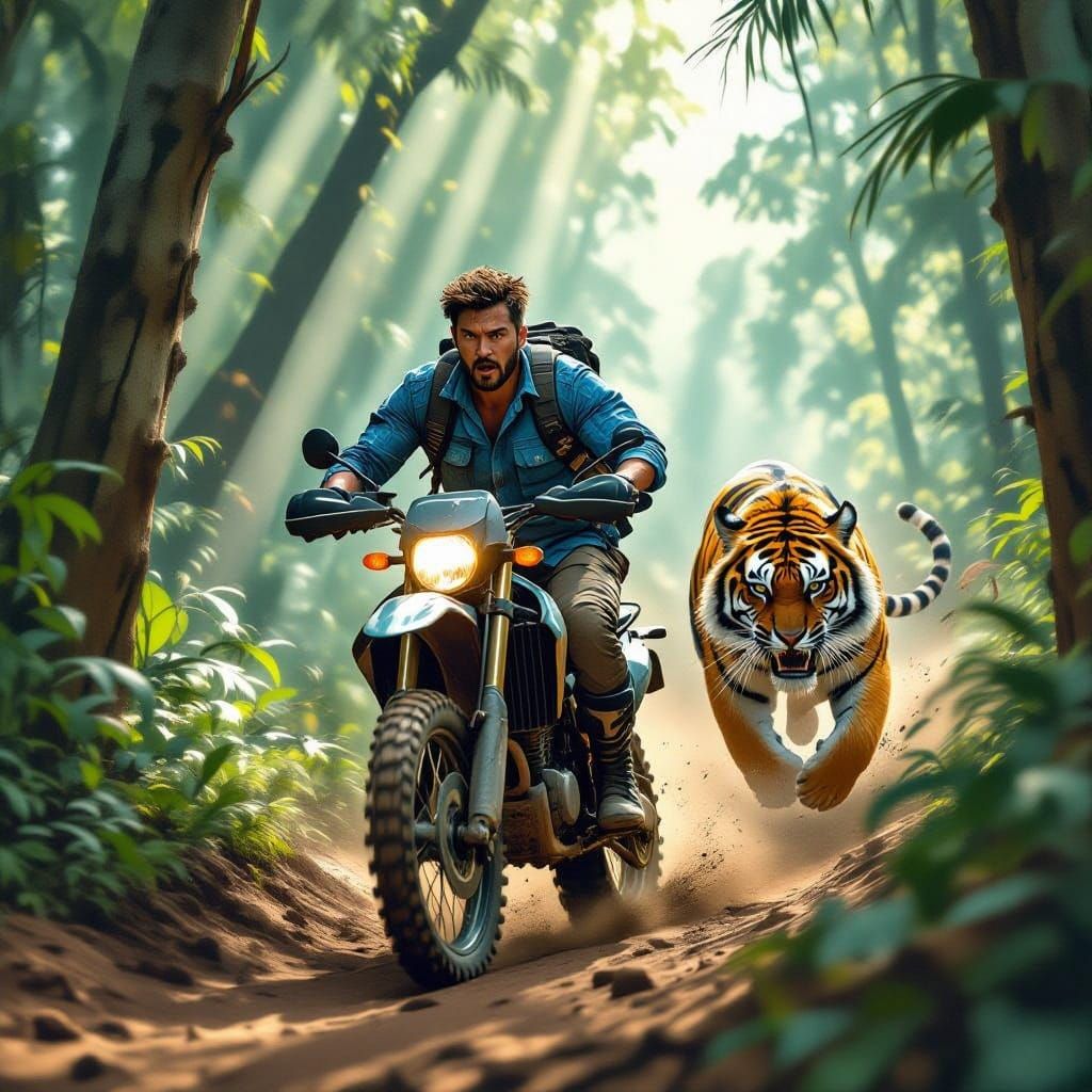 A high-octane image of a rugged adventurer racing through a dense jungle, with a fierce tiger hot on his heels, captured in a cinematic 16:9 ratio with dynamic intensity reminiscent of Syd Mead and Ash Thorp's iconic art style.