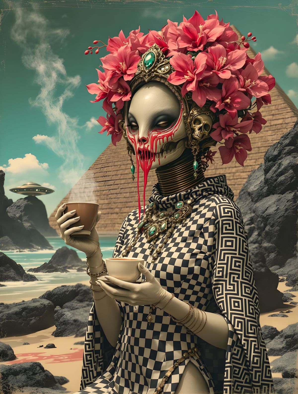 An alien woman with a head portal and crimson orchids holds coffee, wearing a Greek key cloak. Features digital realism and acrylic texture.