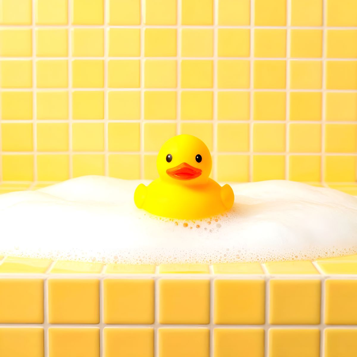 This image captures a yellow rubber ducky floating in a foamy bath, set against a backdrop of yellow square tiles. Captured in minimalist still-life photography with bright, flat lighting and perfect composition.