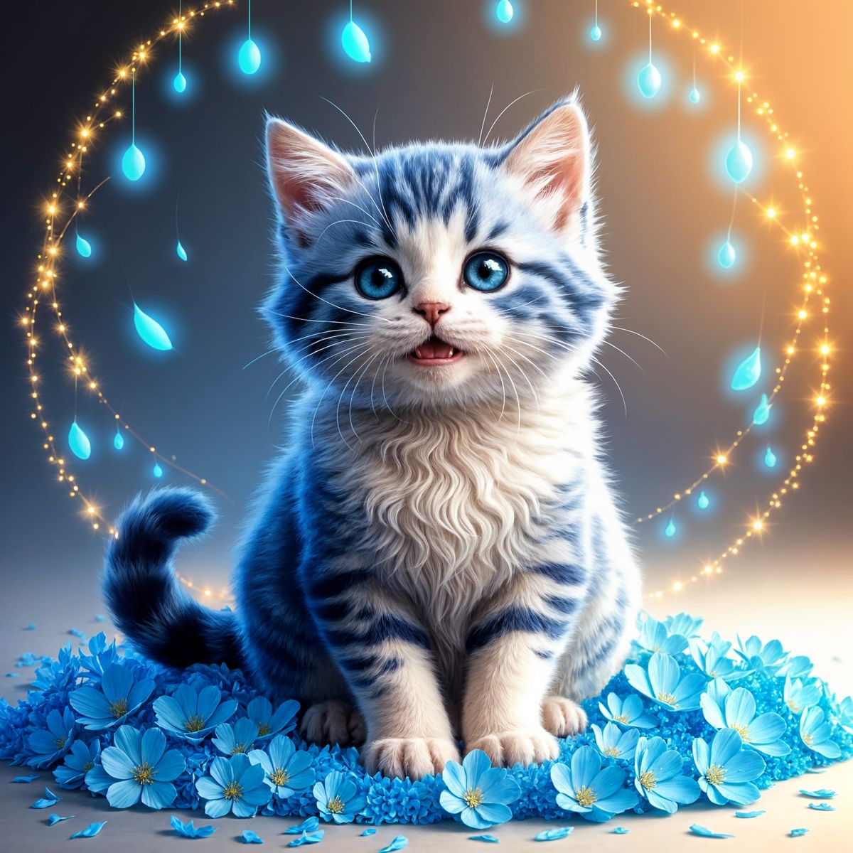 This image shows a cute blue and white kitten sitting on shimmering blue flowers. The digital art style features meticulously detailed fur and glowing lights, creating a magical atmosphere.