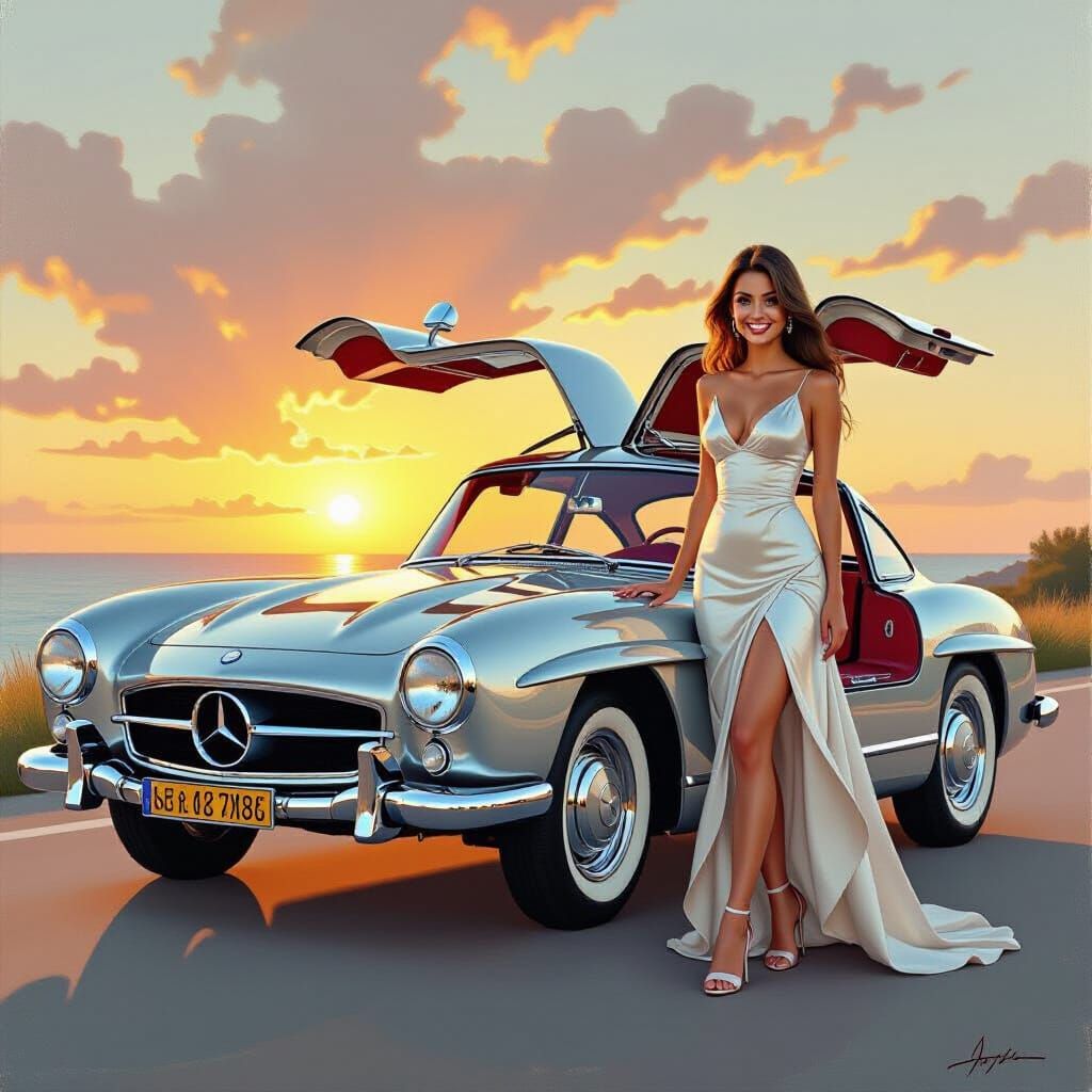 A vibrant oil painting of a classic Mercedes 300 SL with a beautiful woman in a flowing dress standing beside it. The artwork is reminiscent of classical realism with intricate brushwork.