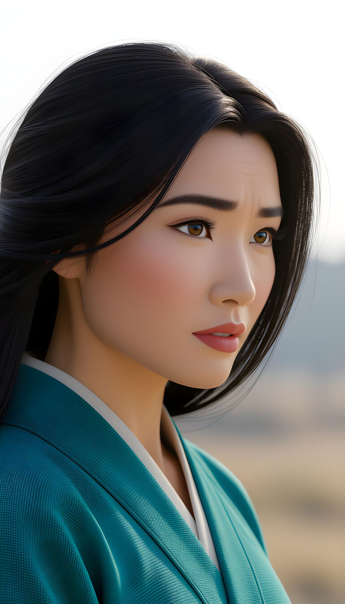 A hyper-detailed, ultra-sharp close-up portrait of Mulan, rendered in a Pixar style with cinematic lighting and film grain for a dramatic, live-action feel.