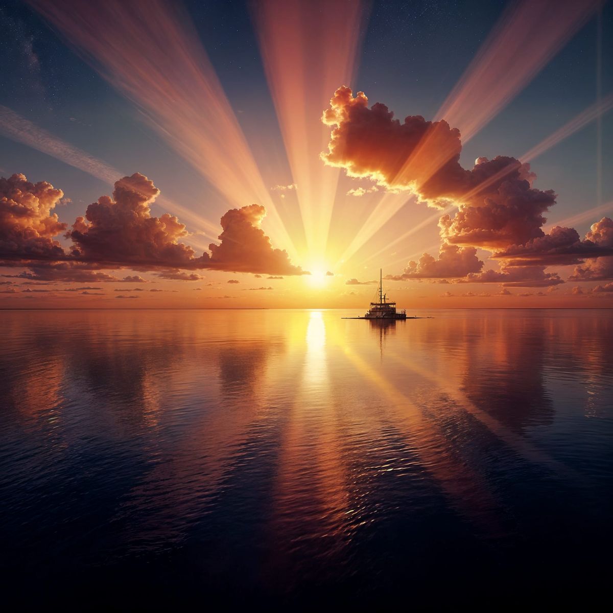 A photorealistic image captures a vibrant sunset over a tranquil ocean. Intense orange and red hues reflect on the water, with light beams radiating from the sun. Features a building silhouette and warm, golden hour lighting.