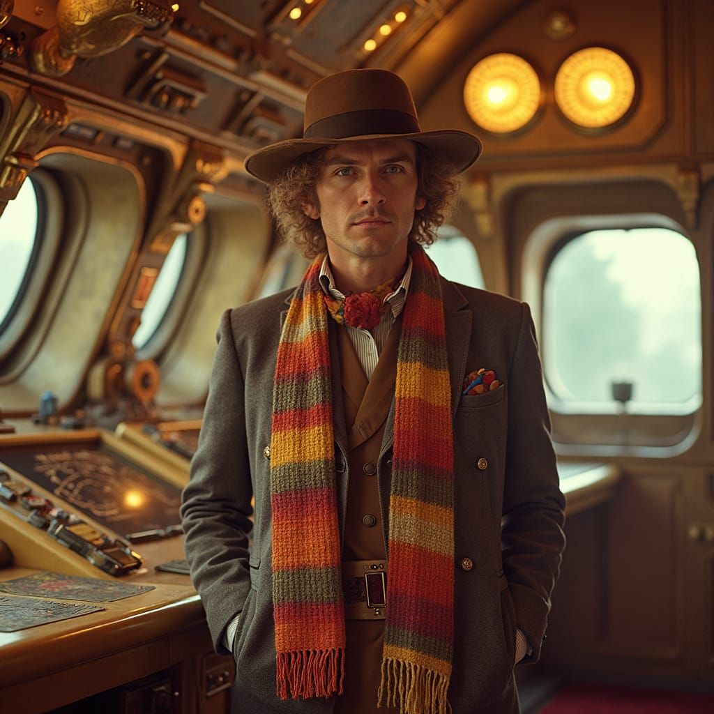 A vibrant image of a Gene Wilder look-alike cosplaying as the Fourth Doctor in the TARDIS. The scene features steampunk elements with warm lighting, reminiscent of retro science fiction art.