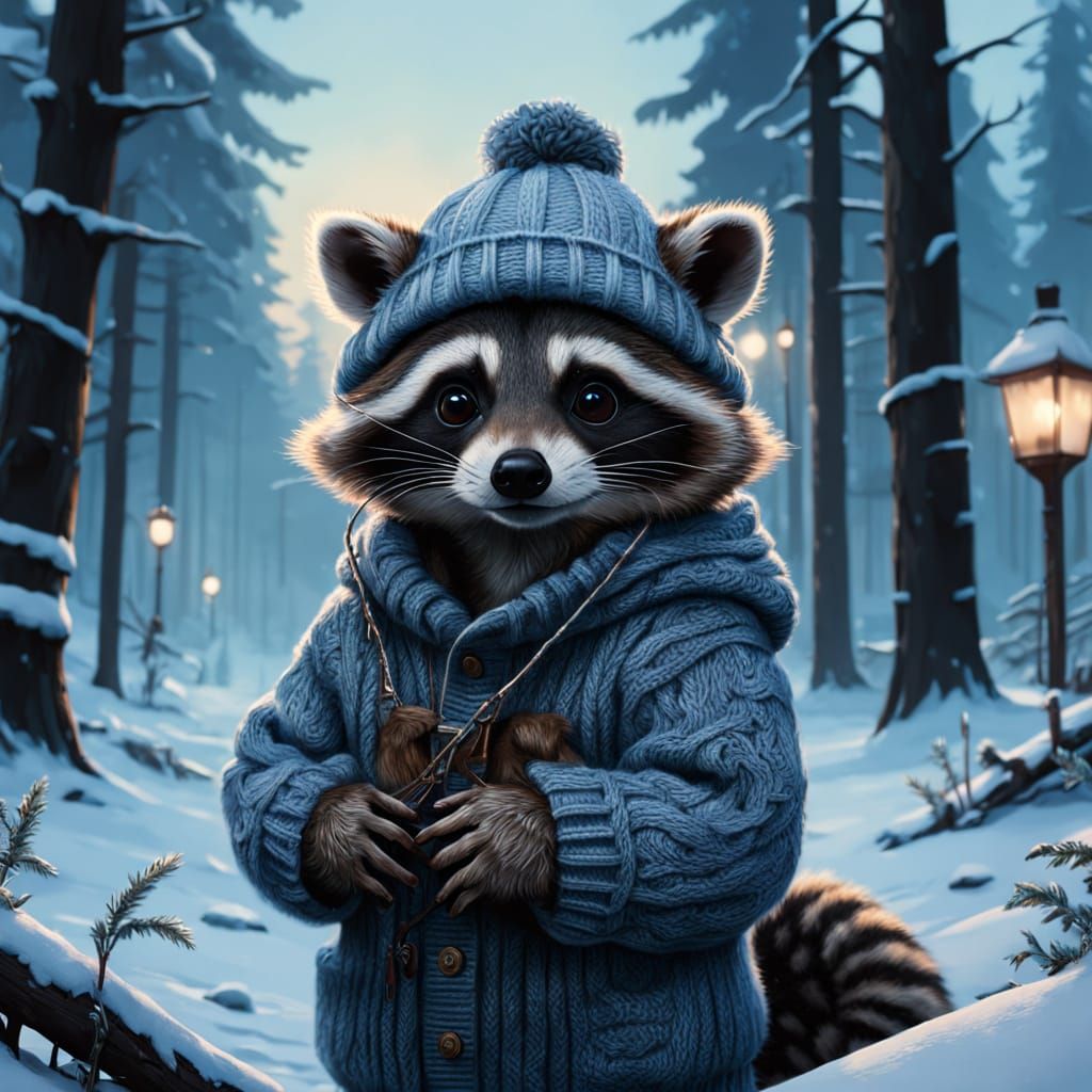 This image shows a baby raccoon snuggled up in a glittery soft blue jumper, set against a warm, cinematic background with soft focus and subtle lens flares, evoking a whimsical and dreamy atmosphere reminiscent of a magical, snowy forest at dusk.