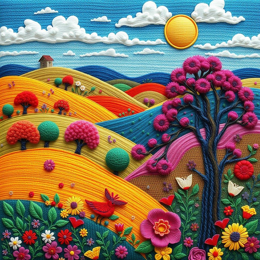 This image shows a vibrant, embroidered landscape with rolling hills, intricate trees, and fantastical floral patterns, characterized by bold textures and delicate lace-like details, evoking the dreamy styles of Eastern-inspired art.